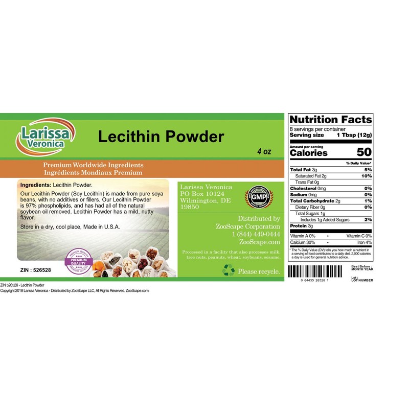 Our Lecithin Powder (Soy Lecithin) is made from pure soya beans, with no additives or fillers. Our Lecithin Powder is 97% phospholipids, and has had all of the natural soybean oil removed. Lecithin Powder has a mild, nutty flavor. - Larissa Veronica is an exclusive line of natural premium-quality products that use only the purest and finest ingredients from around the world. Larissa Veronica is hallmarked by the highest possible standards of purity, stability and freshness. All of our products are prepared with the highest elements of quality control, from raw materials through the entire manufacturing process, up to and including the moment that the bottles or bags are sealed for freshness and shipped out to you. Our highest possible standards are certified by independent laboratories and backed by our personal guarantee. - Larissa Veronica strives to make all products affordable and we are constantly researching the market to maintain our affordability and to look for new ways to serve you and the ones you love. Larissa Veronica has become a trusted household name for many families. - Larissa Veronica is packed in tamper-proof, food-grade, recyclable containers. - ZooScape is proud to be the exclusive distributor of all Larissa Veronica spices, snacks, foods and ingredients in the United States, Canada and around the world. - Store in a dry, cool place, Made in U.S.A.