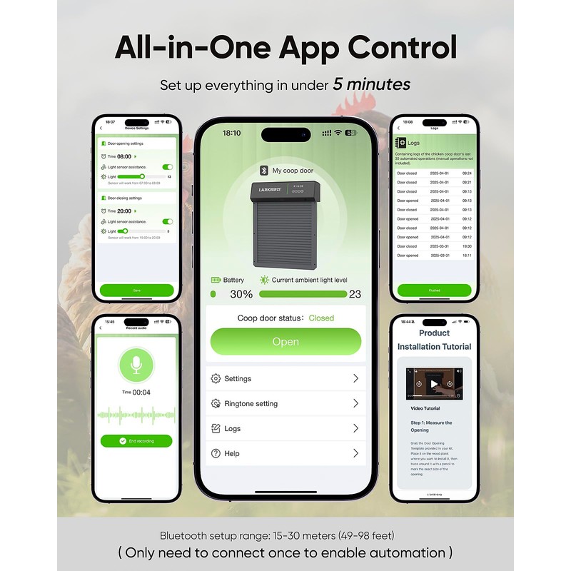 - All-in-One App Control: No complex panel settings required. Simply use our Bluetooth App to set your auto chicken door schedules, customize recall audio, adjust light sensitivity, view activity logs, etc. - all at your fingertips. Bluetooth setup range: 15-30 meters (49-98 feet). Set it once, and the chicken coop door will keep running automatically based on your settings