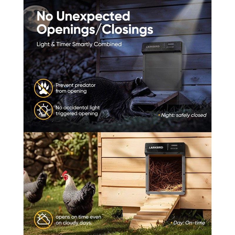 - Smartest Light Assistance: Our innovative [Timer+Light] mode not only enables the coop door to operate based on light but also prevents random openings and closings at unwanted times, offering far greater reliability than the traditional light-only models