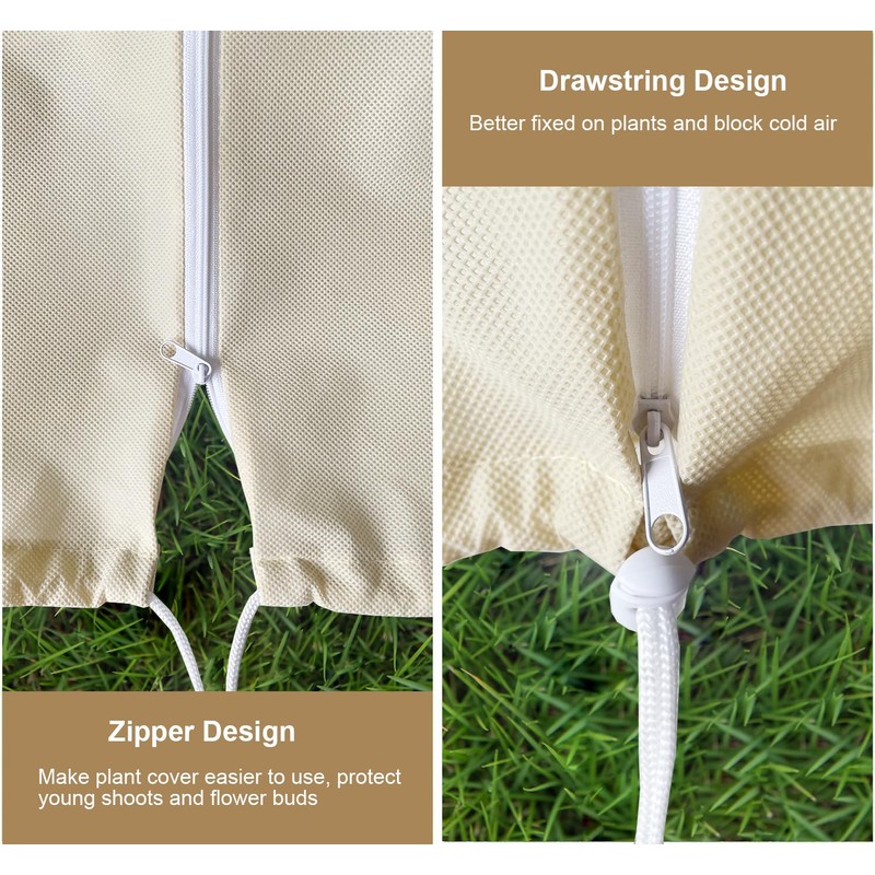 • 【Easy to Use without Damaging】Featured a zipper and drawstring design, more convenient to cover, The easy-on, easy-off zippered covers reduce the risk to damage young branches or flower buds when covering or removing. The drawstring allows you to fix the cover tightly at the bottom of the plant or the pot and keeps it in place even when it's windy. These covers allow air and light to reach the tree but provide insulation from frost.