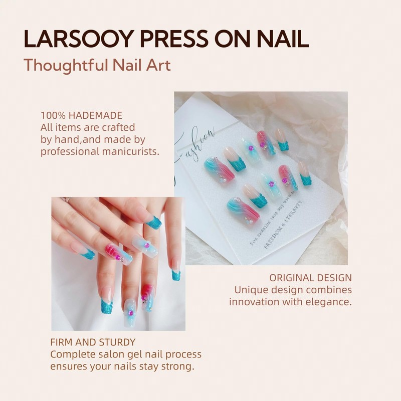 - Handmade Nails: We take pride in crafting all false nails by hand, which are carefully designed, crafted and quality checked by our experienced manicurists. We follow the complete salon gel nail process, including base coat, gel tips, colored gel, intricate designs, and top coat to ensure your nails look natural and stay strong.