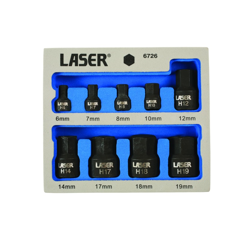 Laser 6726 Low Profile Impact Hex Socket Bit Set 1/4"D, 3/8"D 9pc, Silver