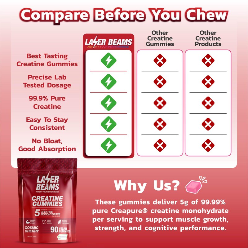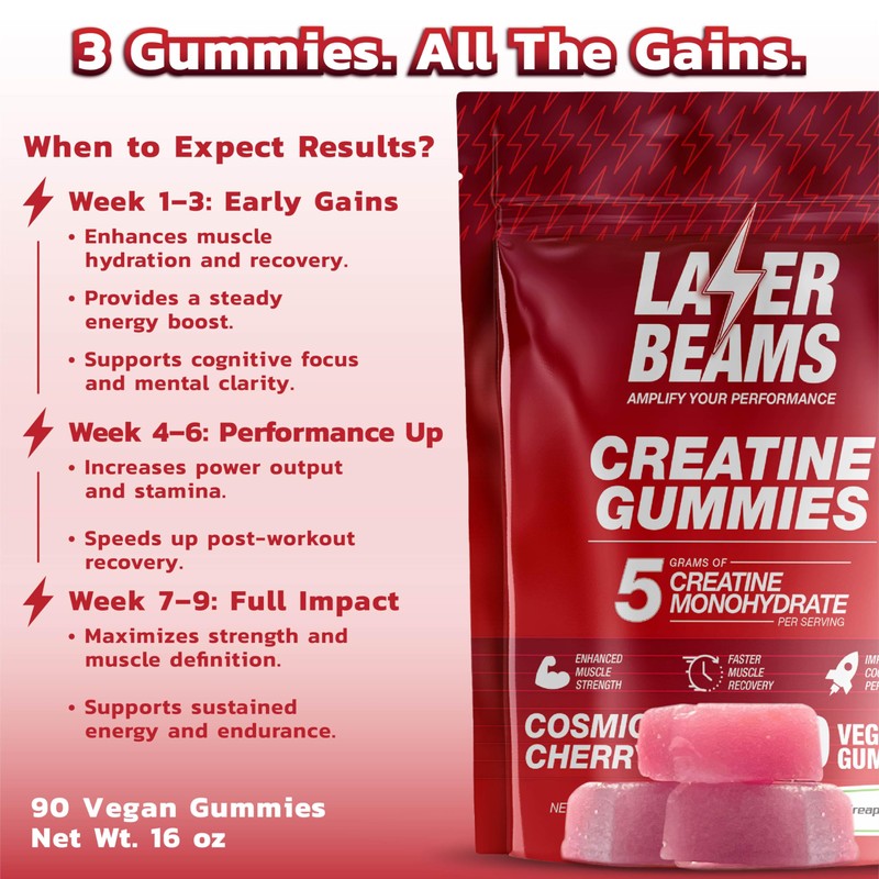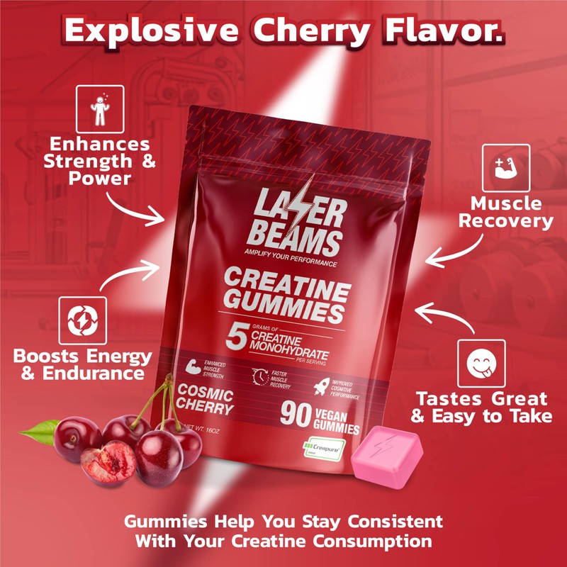 Laser Beams Creatine Monohydrate Gummies for Women & Men - 5g Creapure Creatine per Serving - Vegan, Cosmic Cherry Flavor - Boost Muscle Strength, Endurance, Recovery & Mental Focus (90 Gummies)