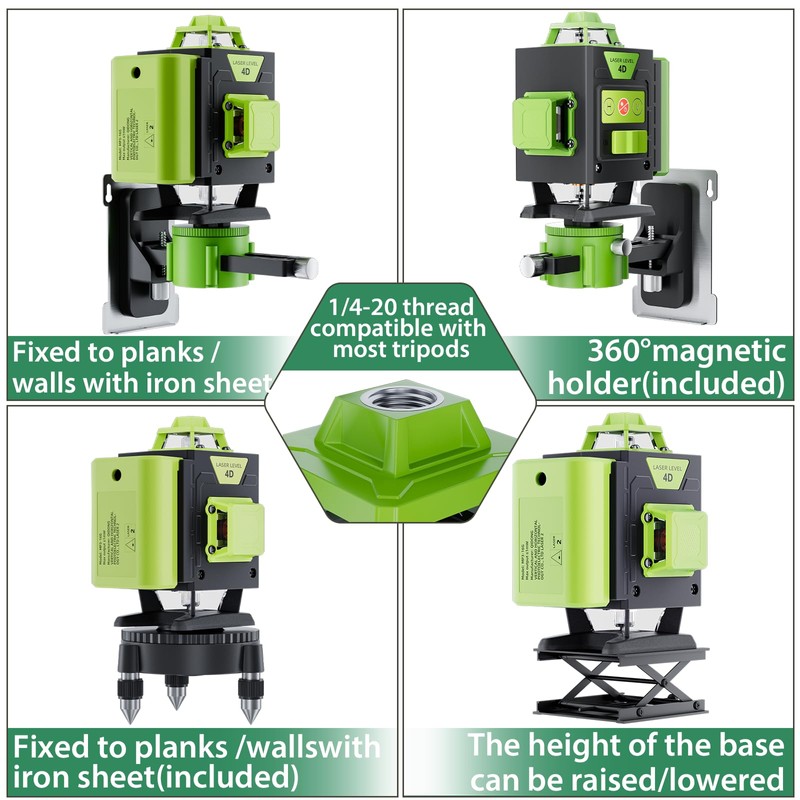 - Remote Control & Multiple Installation Methods--The green laser level features remote control, allowing you to easily turn on/off pulse mode and switch between four laser lines from up to 30 feet away. It includes a 1/4" mounting thread for tripods or poles and comes with a magnetic bracket, mini tripod, lifting base, and 3/8'' adapter for versatile use. The green laser level can be attached to tripods, floor tiles, wall stickers, and ceilings for various applications