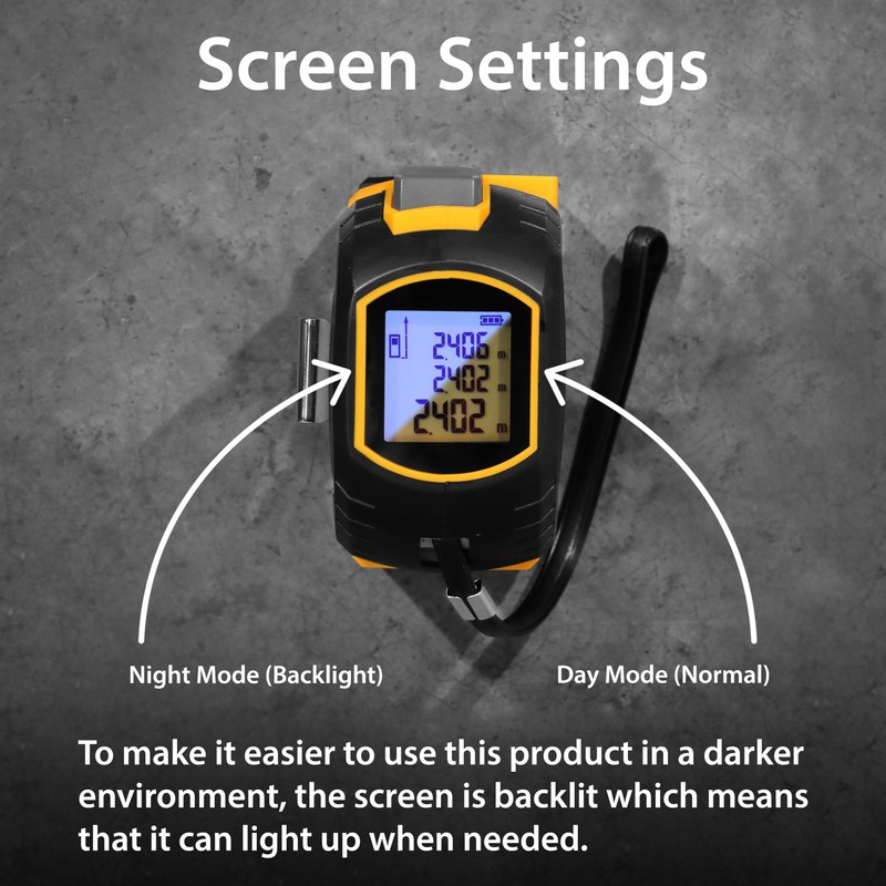 - NO SQUINTING EYES: Digital measuring tape with Easy-to-Read large LCD Display, which is backlit and conveniently located right on the top. It shows current measuring laser function, calculation mode, and readout at a quick glance; Also gives audible prompts and stores up to 20 measurements so you won’t miss a thing