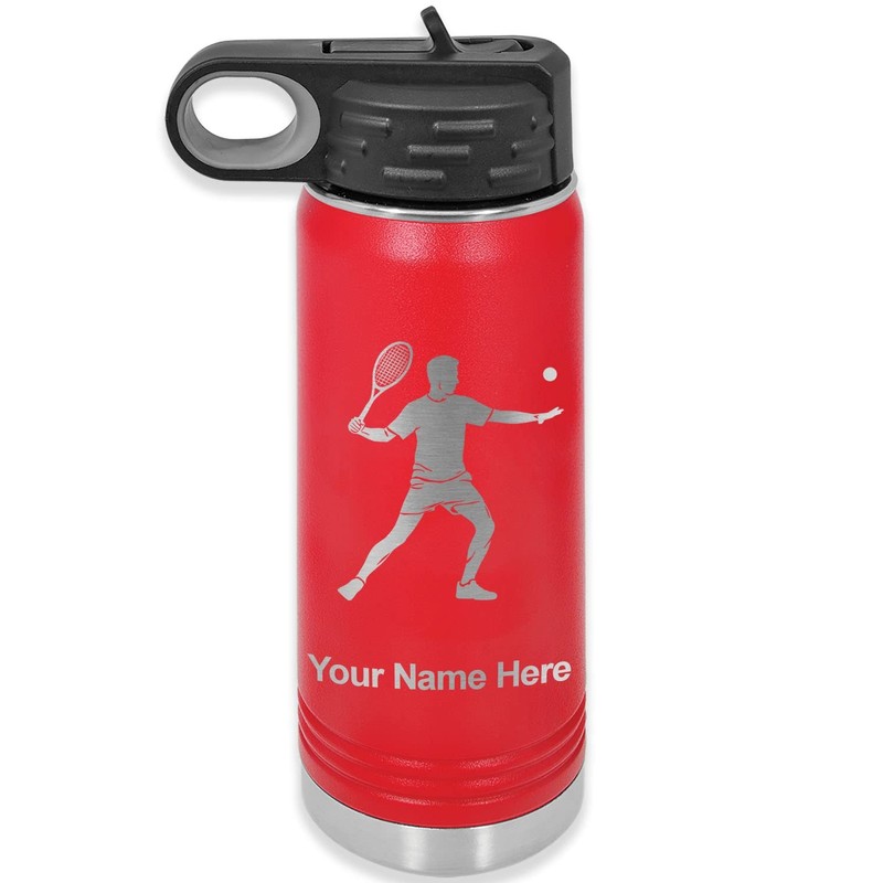 LaserGram Personalized Water Bottle, Tennis Player Man, Stainless Steel Double Wall Vacuum Insulated with Flip Top Straw, Custom Engraved Gift (20oz / 590ml Red)