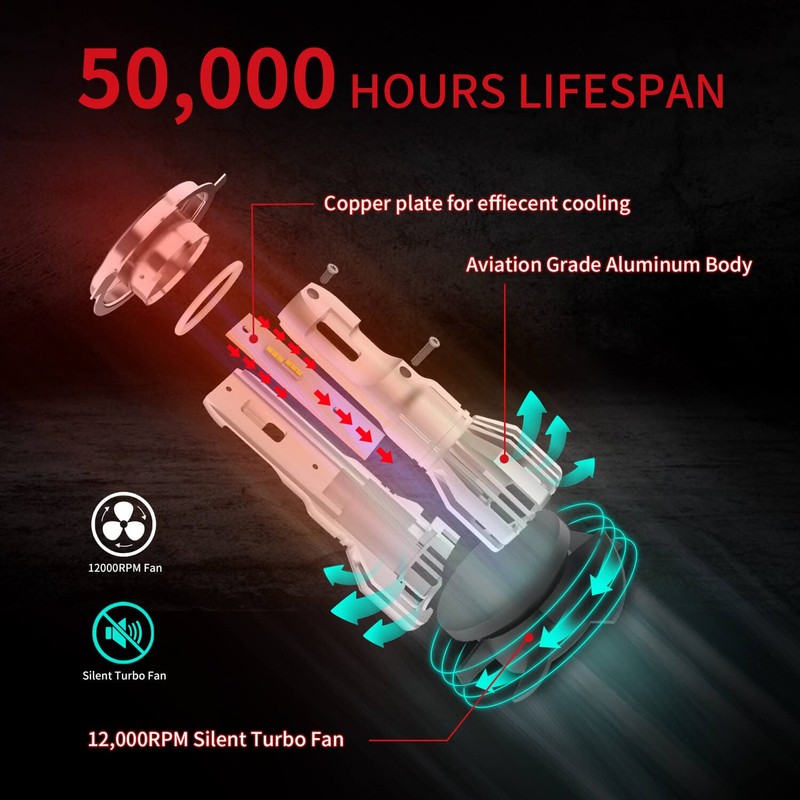 - 【50,000 HOURS LIFESPAN】: LASFIT H4 bulbs built with copper core thermal heatsink and coated with aviation aluminum, combined with 12,000rmp cooling fan, ensure maximum cooling, make the bulbs shine up to 50,000 hours.