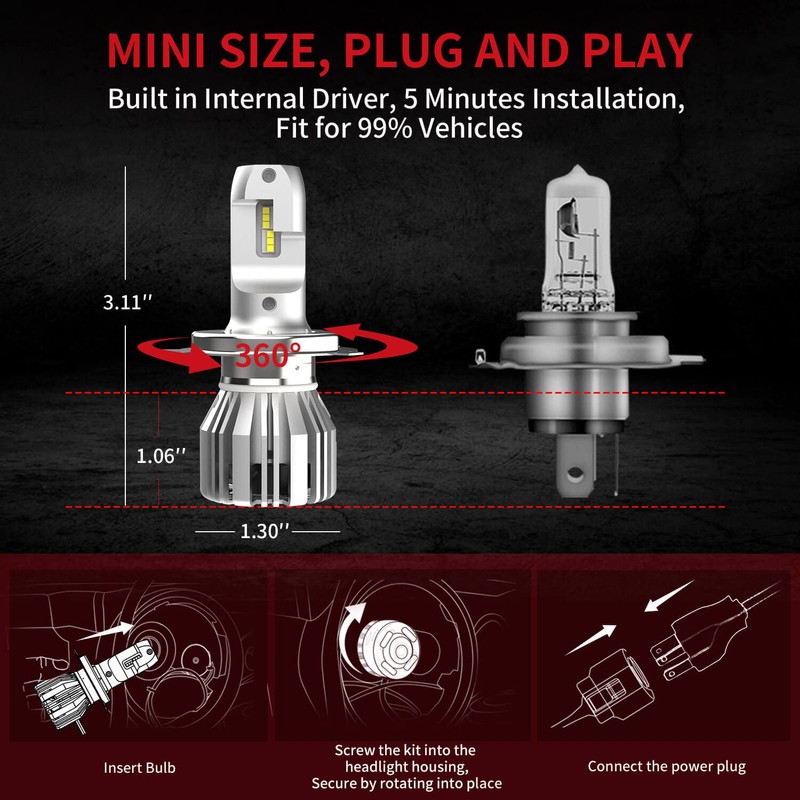 - 【5-MIN EASY INSTALLATION】: 1:1 same size like halogen bulb. No tools needed to replace the lower profile bulbs. Fits for 99% of vehicles, no need to modify or change dust cover, truly plug-n-play installation takes just minutes.
