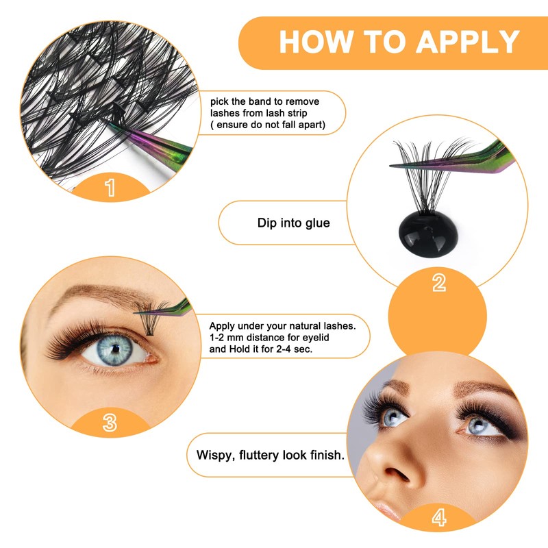 - 【Suitable to wear】: Use a tweezer to pinch the band of cluster eyelashes and apply lash clusters below your natural lashes. You can barely feel the cluster lashes. The bottom of the clusters is flat and hardly noticeable. The lash band part will not stab your eyelid area when you blink. Bring you a perfect experience during lash application.