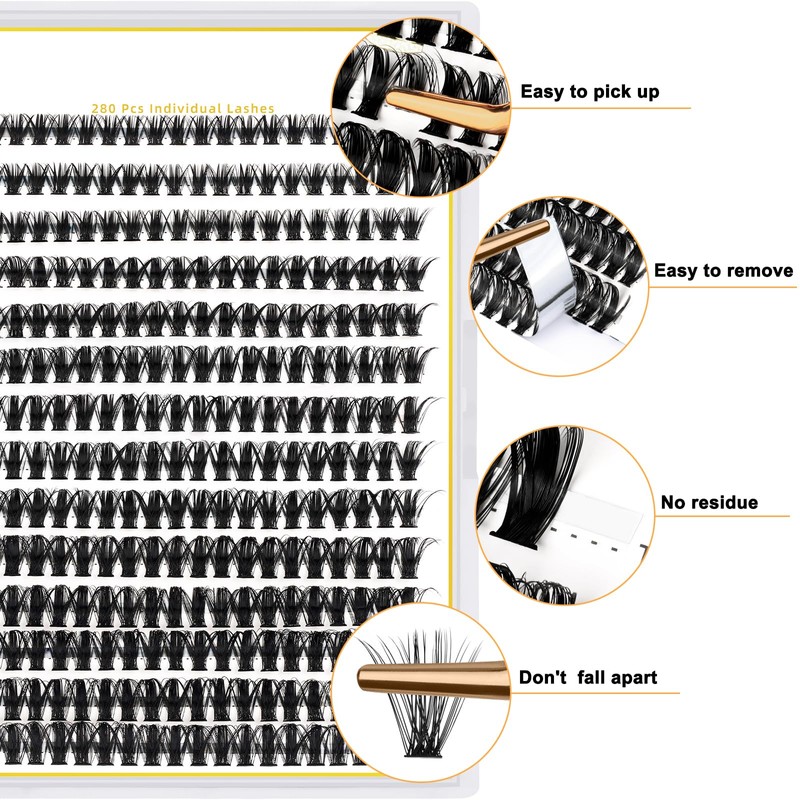 - 【DIY individual clusters at home】: 280 clusters in one tray. You can apply cluster lashes at home by yourself. Easy to put lashes on, gorgeous results, and lash clusters are not easily fall apart. Cluters take less time to complete each eye. Now save so much money and time.