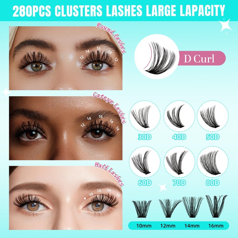 - 【You will get】AMZGlRL provide 280Pcs 70D lash clusters in one tray. based on your preferences and desired cluster eyelash extensions visual effects,you can diy at home instead of salon, save more money and time for makeup, more convenient.