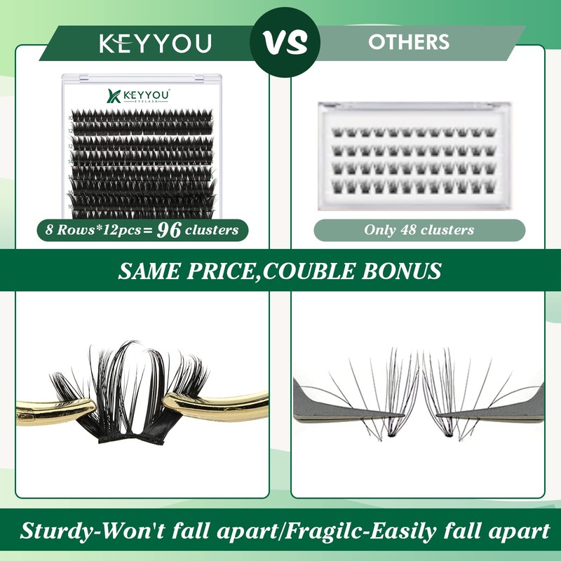- 【Soft&Comfortable】KEYYOU lash cluster are made of imported materials,the stem line is thinner and softer, the eyelash cluster are lighter and more comfortable to wear.96 clusters in one tray ,more cost-effective.