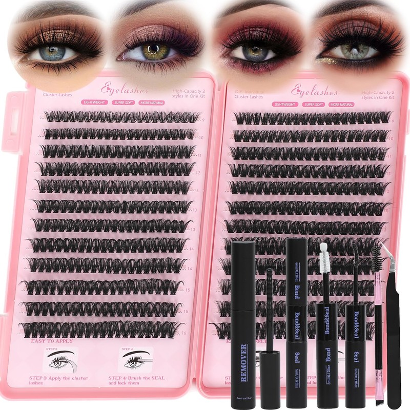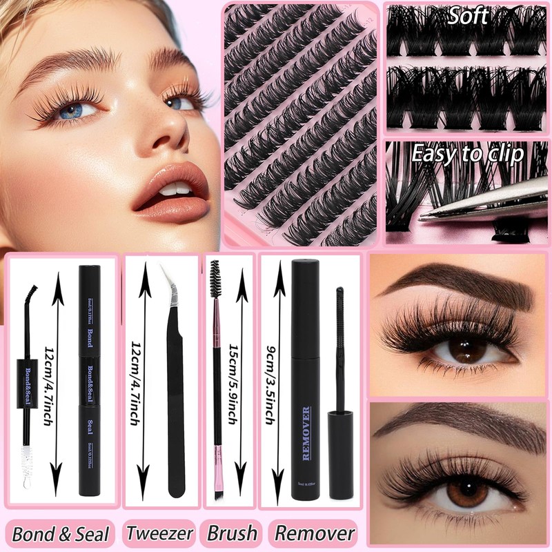 - More Lash Clusters You Get: This lash clusters kit include different density 60D 80D, length 9-16mm, match lash bond and seal, tweezer, remover, brush. No need to to salon, same time and money, You can DIY eyelashes at home yourself