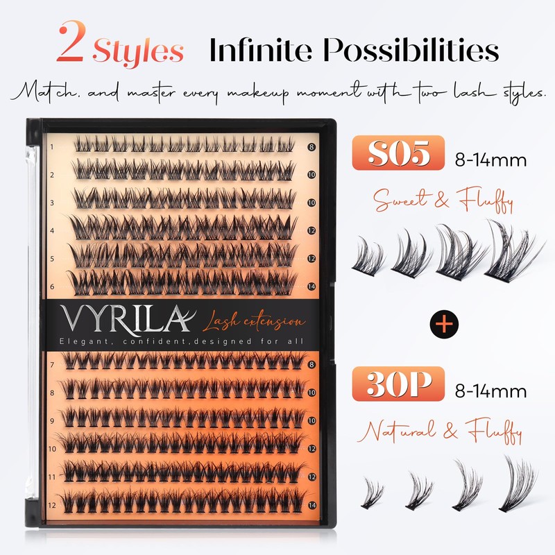 Lash Clusters Kit-VYRILA 0.07mm Wispy 8-14mix C Curl Eyelash Clusters with Lash Bond and Seal Waterproof, Eyelash Tweezers (30P+S05 KIT 192pcs-8-14mix)