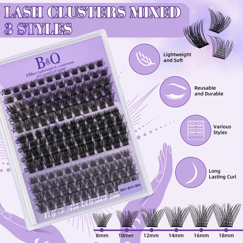 - Superior Lash Extension Kit: B&Q lash extension kit has 156 pcs lash clusters a tray which is mixed styles and length. You can get 3 different lash styles to match makeup. This eyelash extension kit is sufficient to make lash extension at home.