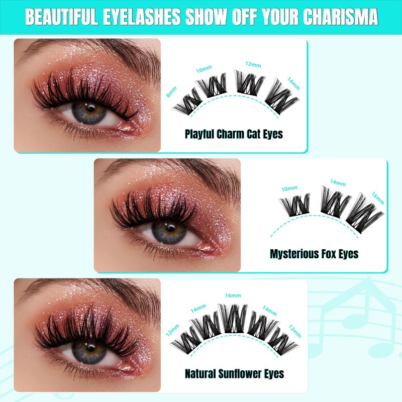 Unique 3D multi-angle cross design,interesting lash clusters from any angle,DIY individual lashes cluster soft and pine,more playful!Ultra-thin eyelashes,immediate use from the rim,very natural,non-plastic feeling.Cotton bands feels so natural,comfortable,soft and lightweight.
