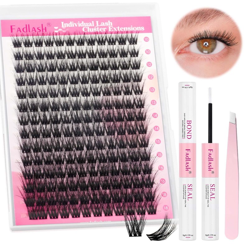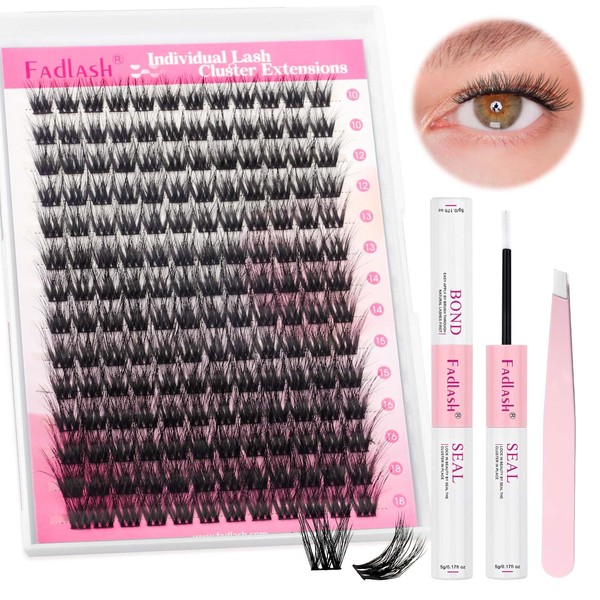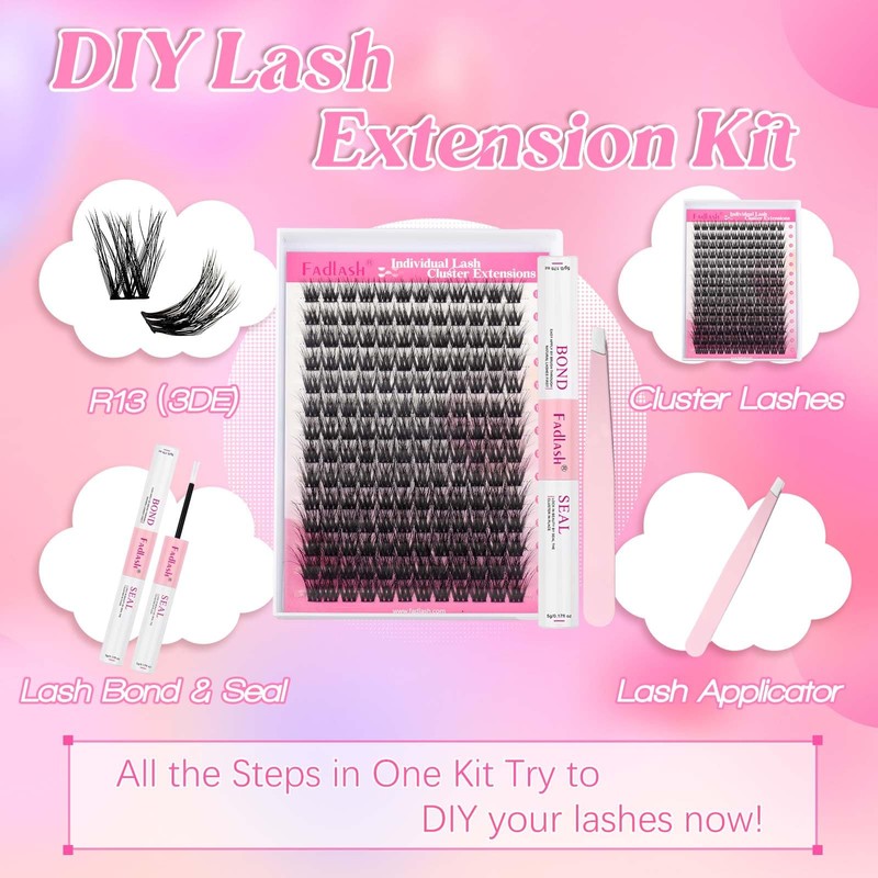 Lash Extension Kit, FADLASH DIY Individual Lashes Clusters Kit with 3D Lash Clusters Lash Bond and Seal and Lash Tweezers for DIY Eyelash Extension Easy to Apply at Home (R13-07-D-10-18MIX)