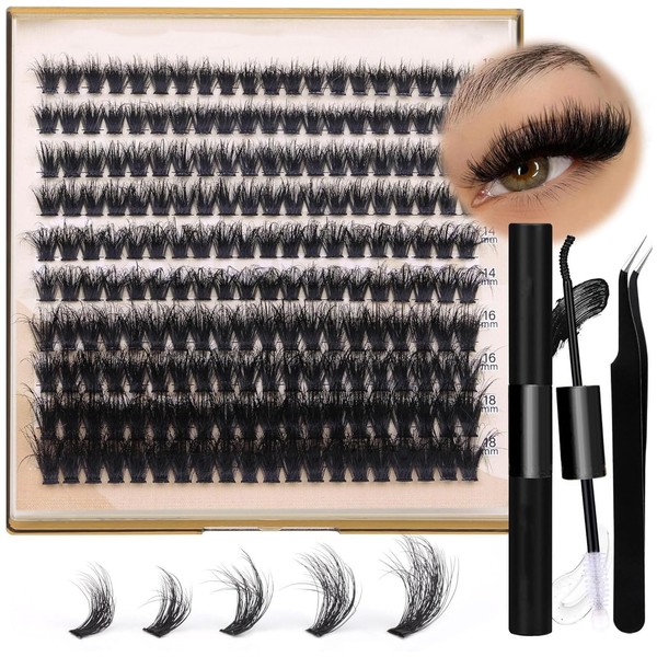 Lash Extension Kit Thick Eyelash Extension Kit 10-18mm Fluffy Lash Clusters 200D Individual Eyelashes Kit with Lash Bond, Lash Remover, Lash Applicator, DIY Lashes Extension for Beginners