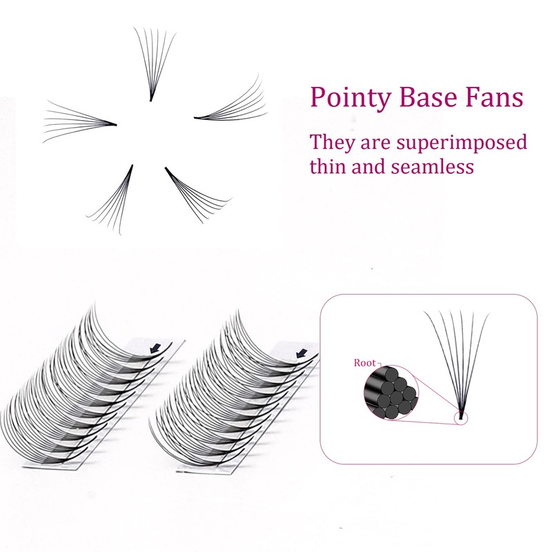 Pointed base middle stem lash Fans:Pointed base middle stem fans feature a shorter base and wider fan, providing a slightly softer, fluffier look closer resembling a hand made fan.
