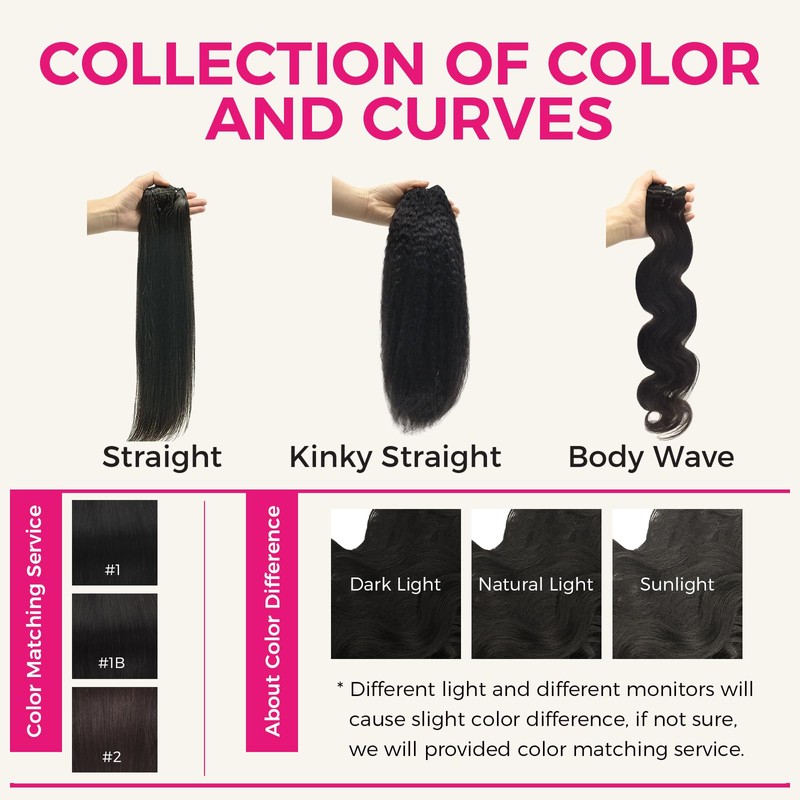 - 4.【Lashey Lace Clip in Hair Extensions Specifications & Recommended Usage】Quantity: 7pcs/9pcs. Weight: 120g/150g. Length: 12-26inch. Texture: Straight, Body Wave, Kinky Straight. Color: Jet Black, Natural Black, Dark Brown. Just to thicken your hair, we suggest 1 pack, for a full head, we suggest 2 packs.