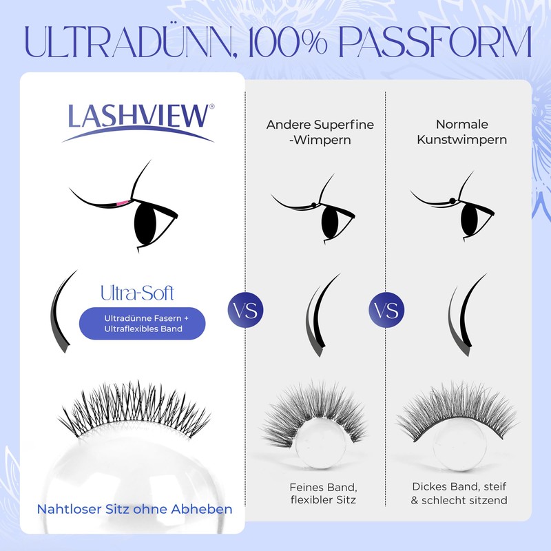 - 【Ultradünnes, flaches Band für nahtlosen Halt】Lashview SoftBloom künstliche Wimpern verfügen über ein extra flaches Band, das sich perfekt an Ihren natürlichen Wimpernkranz anschmiegt. Kein Abheben – für einen unsichtbaren, nahtlosen Look wie echte Falsche Wimpern