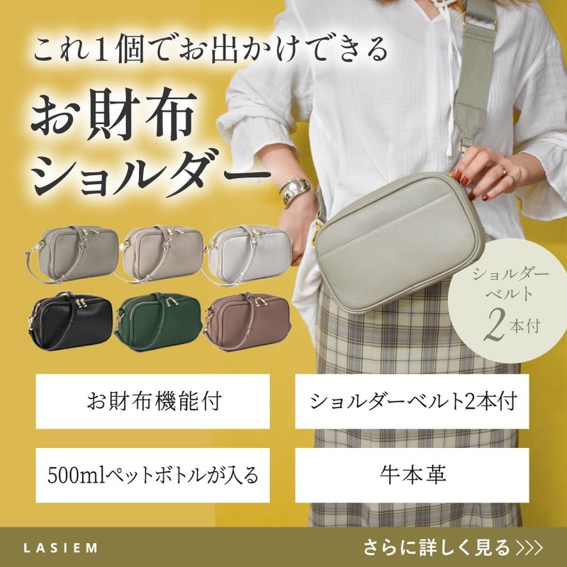 LASIEM Women's Shoulder Bag with Convenient Wallet Function, Simple Wallet Function, Crossbody Bag, Pochette Bag, Leather, Genuine Leather, Black (without wallet function)