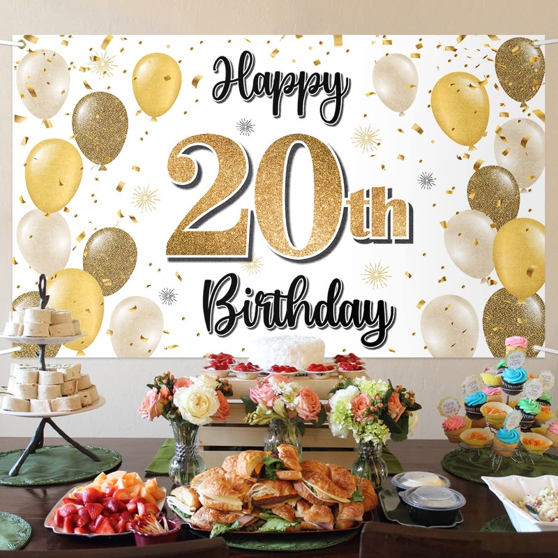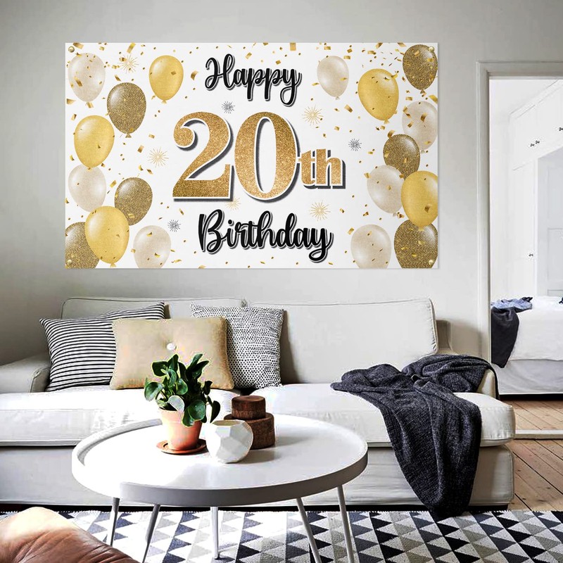 - [WAHT YOU GET]:1pcs "Happy 20th Birthday" gold large backdrop banner and 2pcs rope.You can cut the rope length what you need.Easy to use!