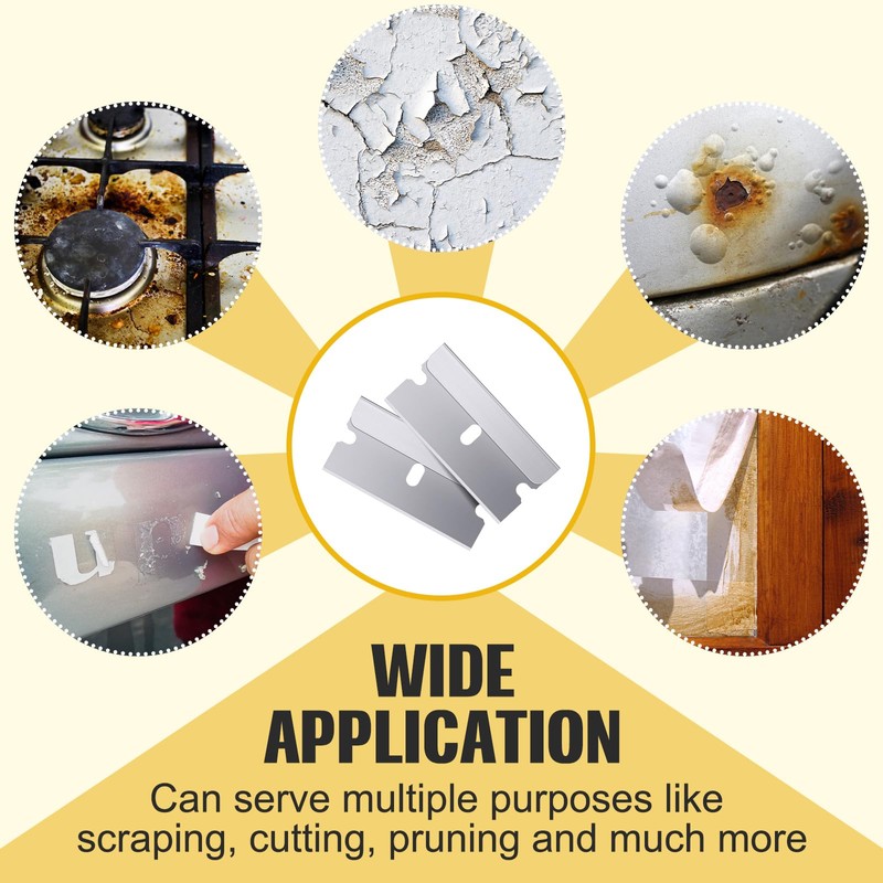 - Versatile Applicable: the utility razor blades can serve multiple purposes like scraping, cutting, pruning and much more; They are handy in removing paint, adhesive, sticker, putty, or decal from different surfaces like glass doors, windows, tiles, walls, floors, plastics, ceramic stoves, cars, wood, basketball courts, and many more; Additionally, they can be applied for simple cutting work