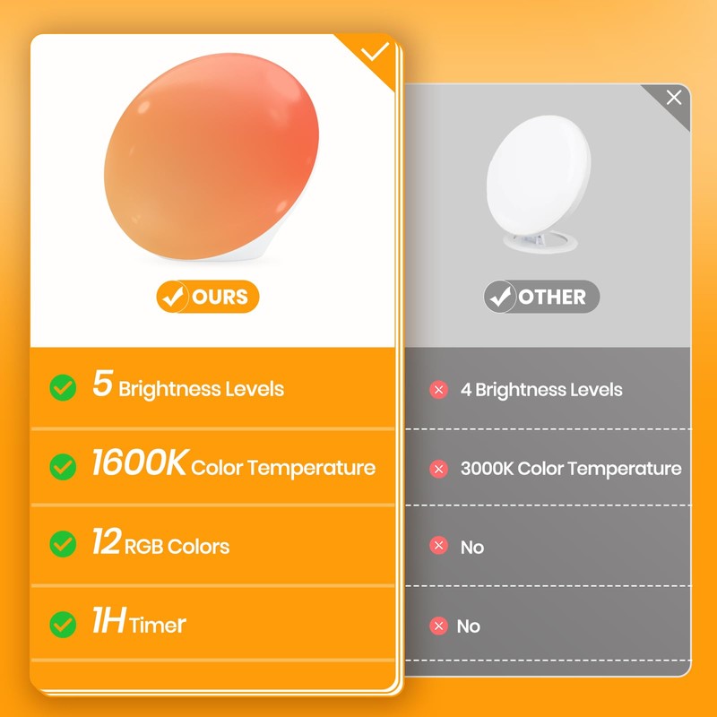 - 12 RGB Colors to ChooseThis sun lamp provides you full brightness at only 12W with 66 LEDs, providing a full dose of light from 20 inches away, so as to help brighten up your office space.