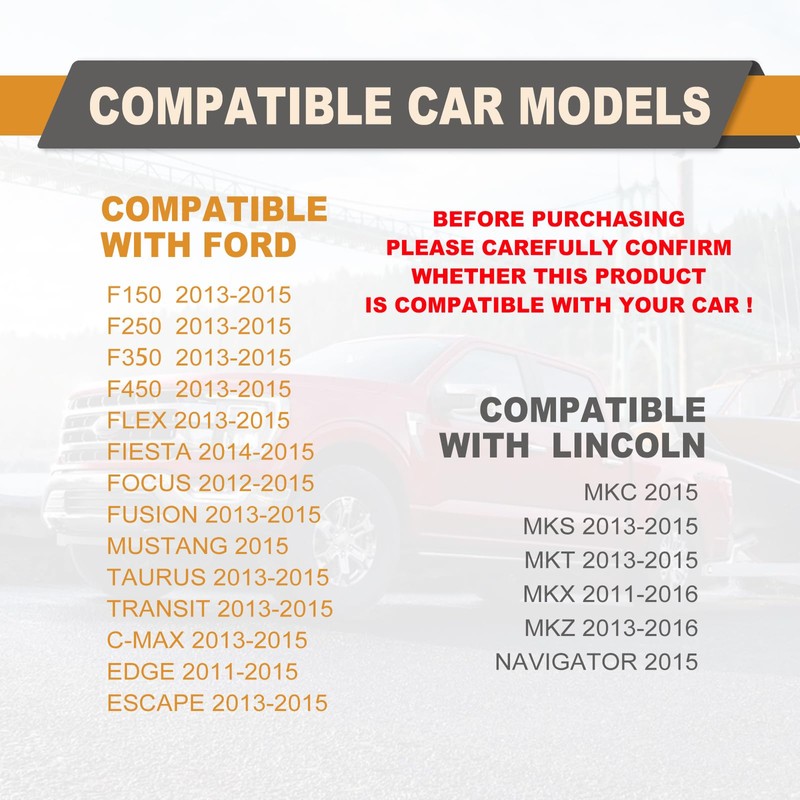 - Compatible with Ford: C-Max (2013-2015), Edge (2011-2015), Escape (2013-2015), Escape Hybrid (2013-2015), Explorer (2011-2016), F-150/F-250/F-350/F-450 (2013-2015), Fiesta (2014-2016), Flex(2013-2015), Focus(2012-2015), Fusion(2013-2016), Taurus (2013-2015), Transit (2014-2015).
