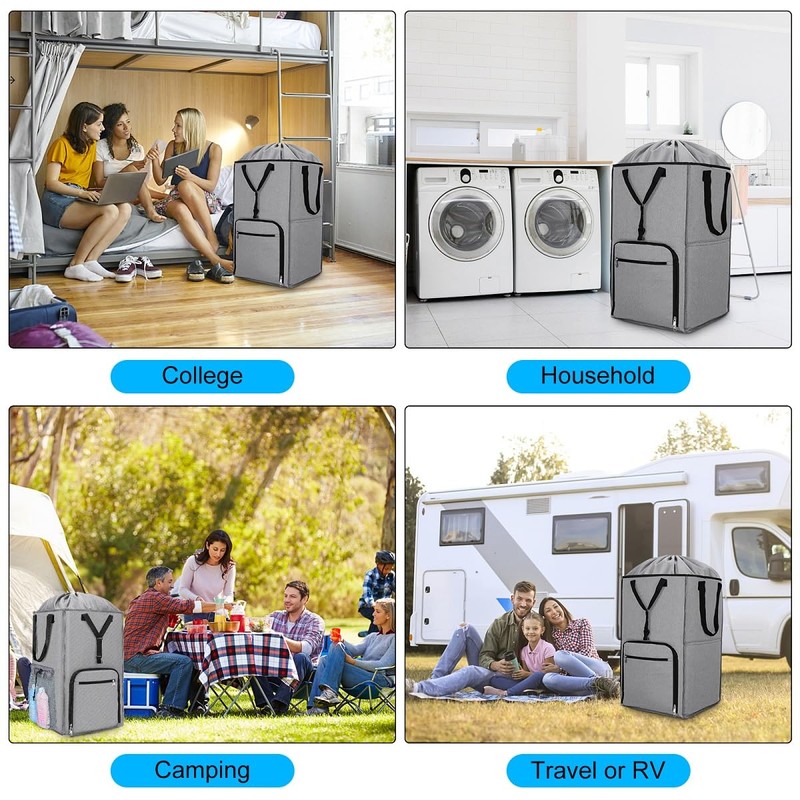 - MULTI POCKET STORAGE - A side mesh pocket with drawstring closure provides additional storage for laundry detergent or fabric softener, and a front pocket with zipper for cell phone, coins or cash change. Perfect for college dorms, camping, apartments, hotels, RVs, and home.