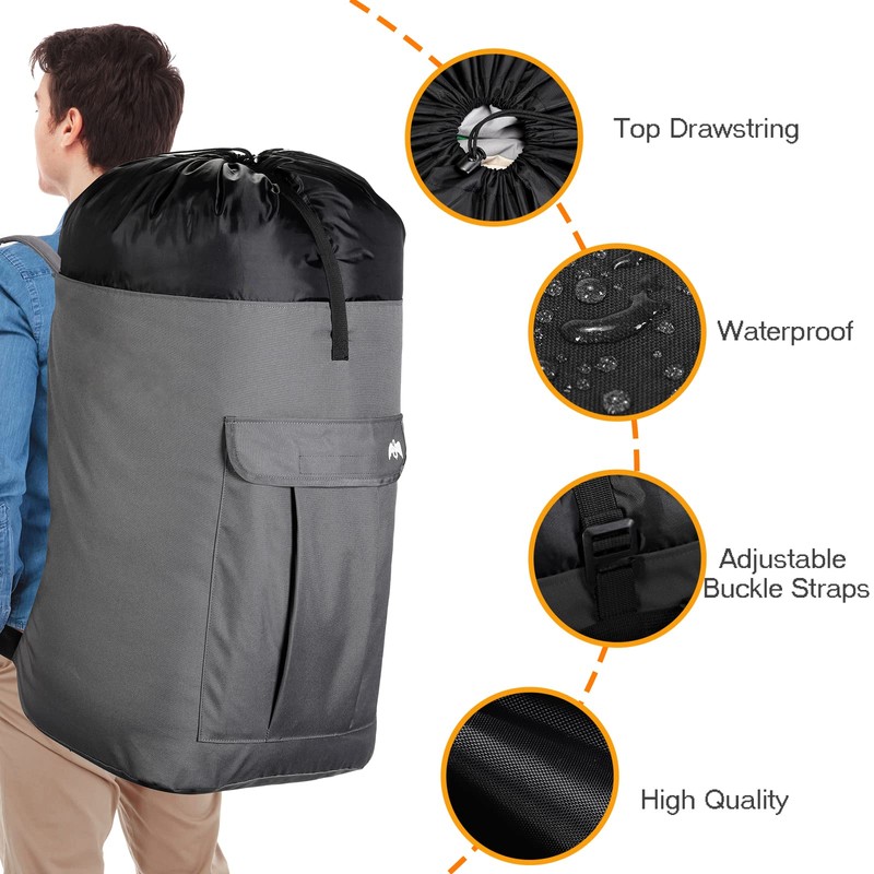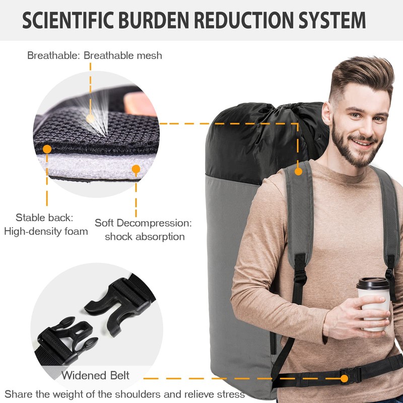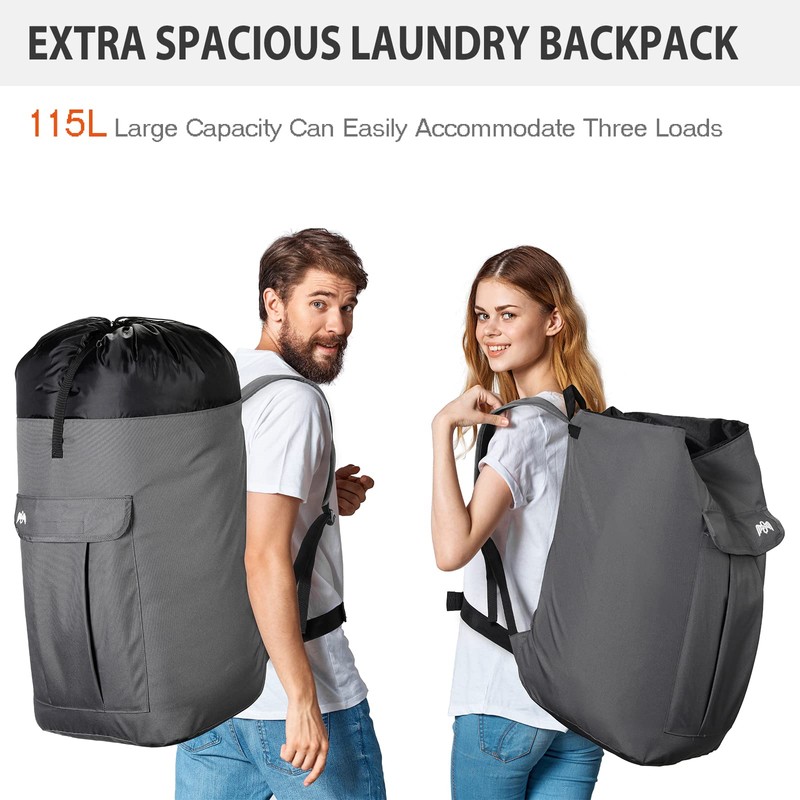 - Humanized Designed: Laundry backpack with belt will share some of the weight of the shoulders to the waist, so as to alleviate shoulders strain caused by prolonged carrying. And adjustable shoulder straps with soft padding can fit a wide variety of people, and we design a drawstring closure on the mouth top, combined with a strap with a buckle which helps to avoid spilling