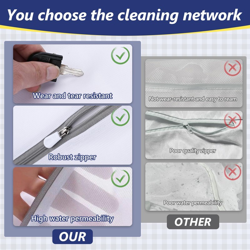 - Safety thanks to zip: the secure and durable zip keeps the mesh bag closed and unhindered washing. It also protects the washing machine from scratches and damage to the zippers and prevents the laundry from being messy after washing.