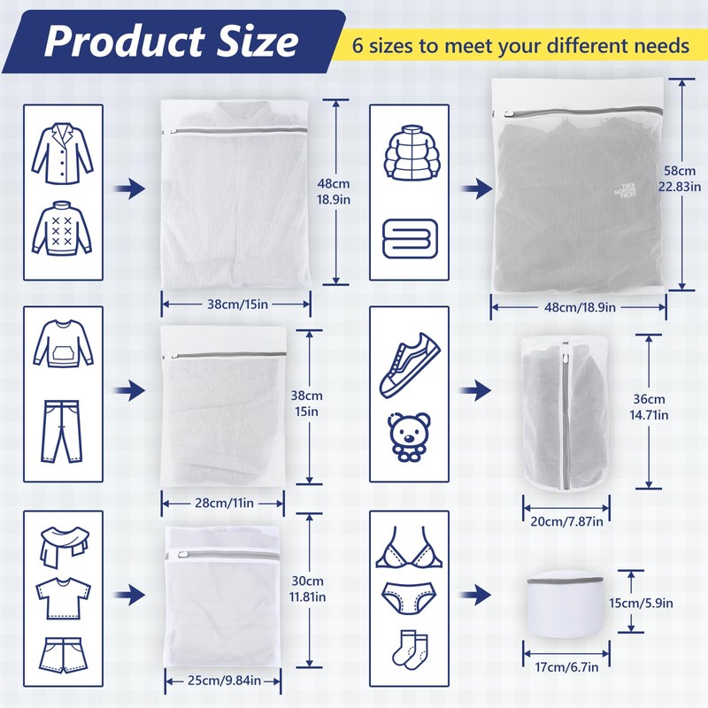 - FOUR SIZES FOR YOUR NEEDS: 2 x large mesh bags (50 x 60 cm), 2 x medium bags (40 x 50 cm), 2 x small bags (30 x 40 cm), 2 x mini bags (25 x 30), 1 x bra wash bag (20 x 17 cm), 1 x cylinder (24 cm). x x 3 cm)