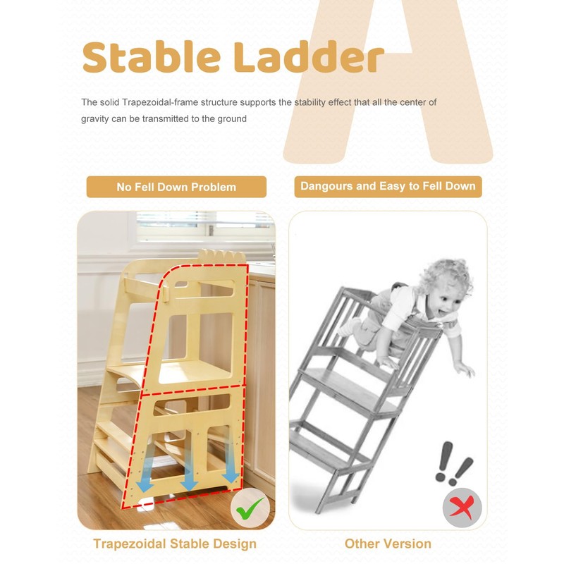 - Safe and Secure Design: Made of composite wood boards with no odor, this stool has a smooth and scratch-free surface for your child's safety and comfort. Sturdy railings and a wide quadrangular base with two thick crossbars ensure stability, with a weight capacity of up to 180 pounds making it perfect for all ages.