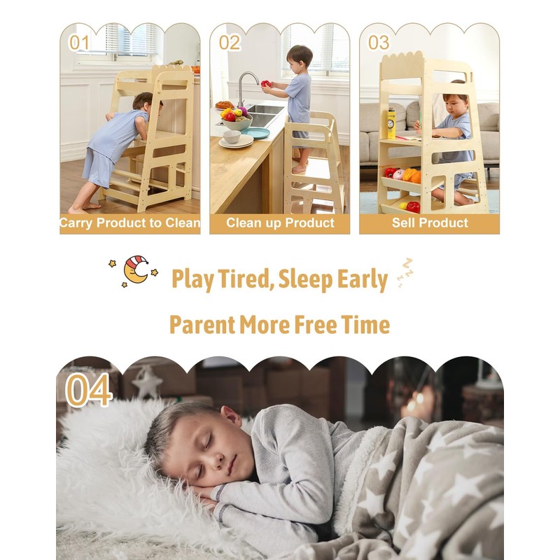 - Fun and Versatile Stalls to Keep Your Child Engaged: With a horizontal pedal for your child to sit on and a designated space to store learning materials, the Kitchen Tower is a perfect addition to your child's learning space. It also doubles up as a fun sales game for playdates at home, allowing your child to enjoy endless hours of fun and imaginative play.