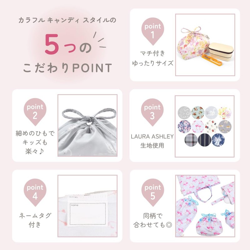 - LAURA ASHLEY lunch bag A drawstring bag that can easily hold 2 tier bento boxes to desserts. The size is easy to store chopsticks and fork cases and is easy to put in and take out
