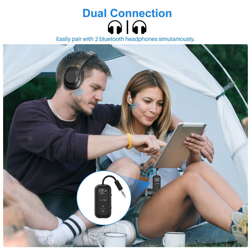 - 【Connect Two Devices, Share Joy】With the Bluetooth transmitter, you can easily link two wireless earphones or speakers simultaneously in TX mode. In RX mode, connect to the Bluetooth of two mobile phones simultaneously. Enjoy sharing audio with your friends and loved ones. Keep in mind that when using dual mode, there may be a slight delay of 200ms.