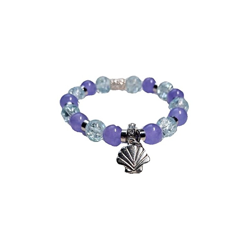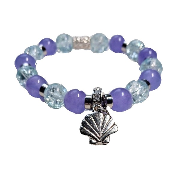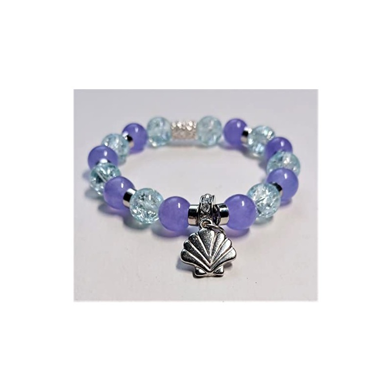 Elegant beachy charm bracelet is sure to provide you with the perfect accent. Stretchy beaded bracelet is approximately 7.5 inches in size with lavender and clear crackle glass 9mm beads and one 10mm silver dangling shell charm. Naturally attractive beaded stretchy bracelet is practical and fashionable. Great accent piece for everyday or for your special occasion. Unique and fashionable. Great for you or give as a gift. Perfect for Valentine Day or Holiday Gifting.