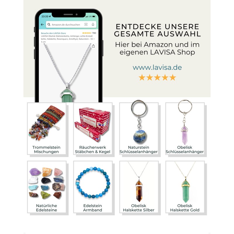 All stones have healing properties with which they act as transmitters and amplifiers of success, love, happiness and health. They enhance your home and workplace with energy and protection, which makes the Lavisa chain your perfect companion in everyday life. The stones are natural products. They may vary in colour, size and shape. Each stone is natural and unique.