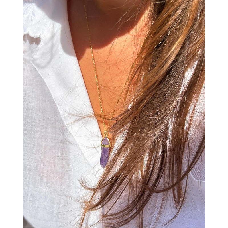 LAVISA Obelisk Gemstone Necklace Gold Pendant Real Crystal Chain Necklace Rose Quartz Amethyst Natural Stone, 55 + 5 cm, Stainless Steel