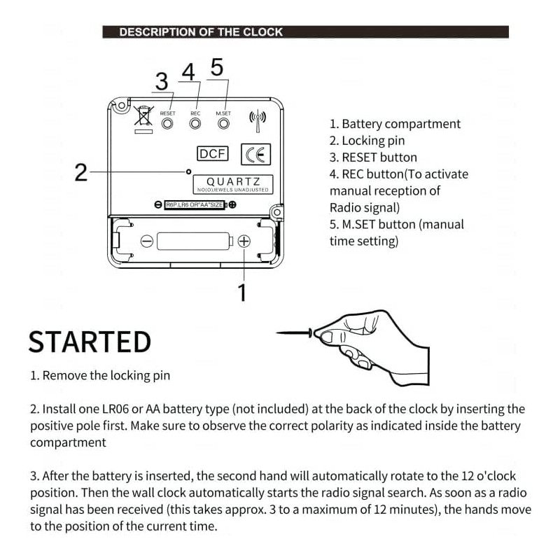 If there is a problem with this step, please press "Reset" on the back. After about 3-12 minutes, when the watch receives a signal, it automatically sets the hour and minute hands. Then the radio clock runs according to the German radio waves.