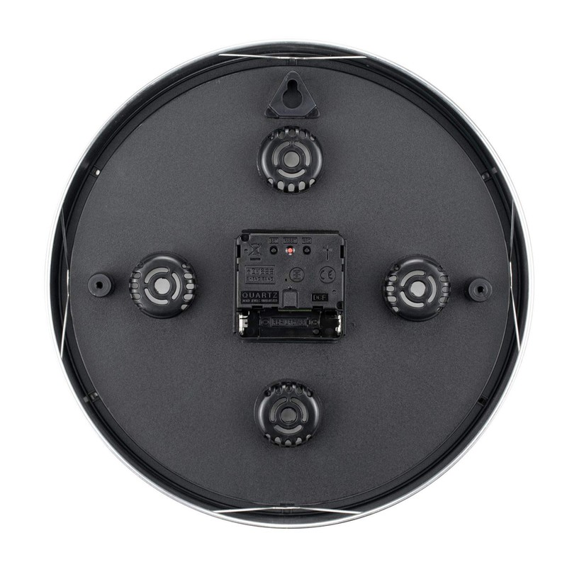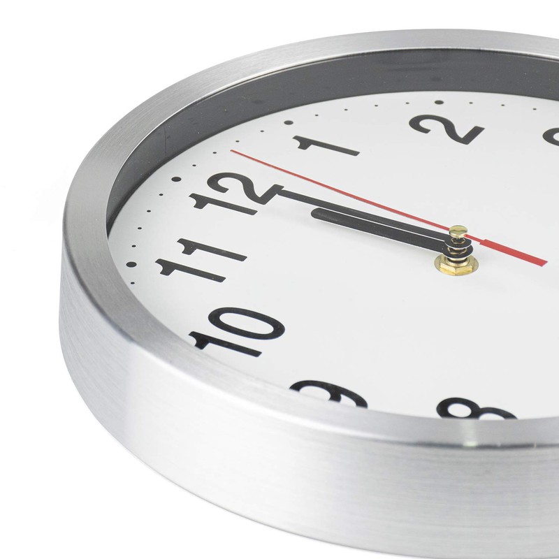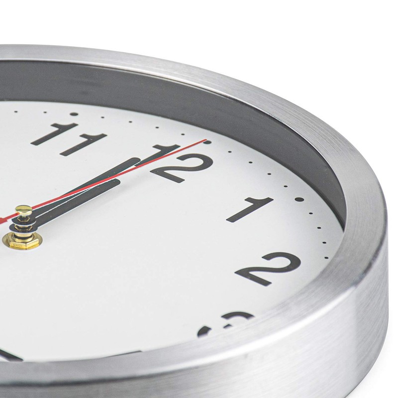 - Diameter: 25 cm. The edge of the clock is made of brushed aluminium. This wall clock requires one AA battery (not included).