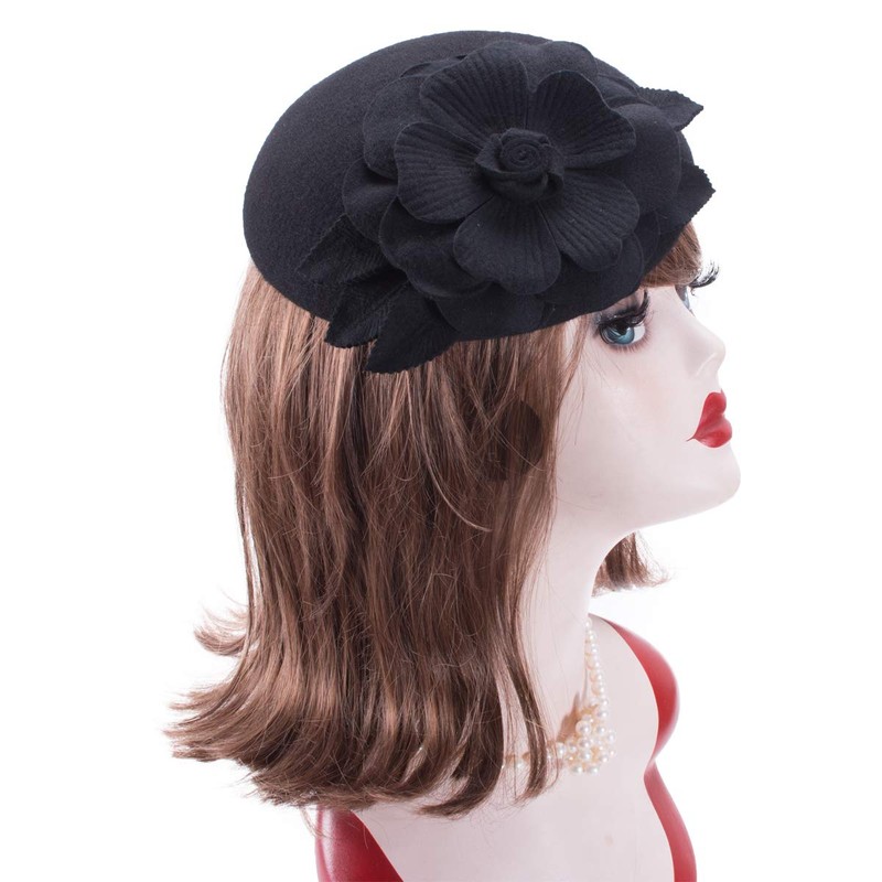 Lawliet Autumn Winter Beret Hat Flower Wool Fascinator Hat Gatsby Style Hair Pillbox Hat Lady Cocktail Wedding Party Dress Fedoras (Black)(Size: One Size)