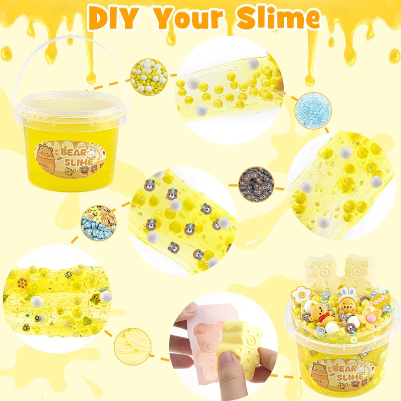 - 【Bear Slime Kit】Our kids slime kit includes 300ml yellow clear slime and 8 packs slime add-ins and 5 cute bear slime charms. Create your own unique slime creations with this clear slime set featuring a bear with a variety of adorable slime charms and rich soft ceramic pieces.