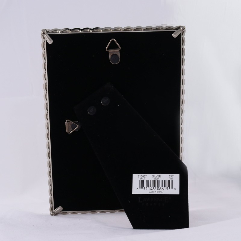 Gorgeous decorative silver metal rope design picture frame. This polished silver metal frame has a rich and lustrous silver finish. High quality black velvet backing with easel for vertical or horizontal tabletop display and comes with hangers for vertical or horizontal wall mounting. Heavy weight cast metal picture frame is made with exceptional workmanship and comes individually boxed. In this style the 8 by 10-inch size comes with a white acid free bevel cut mat for a 5 by 7-inch photo.