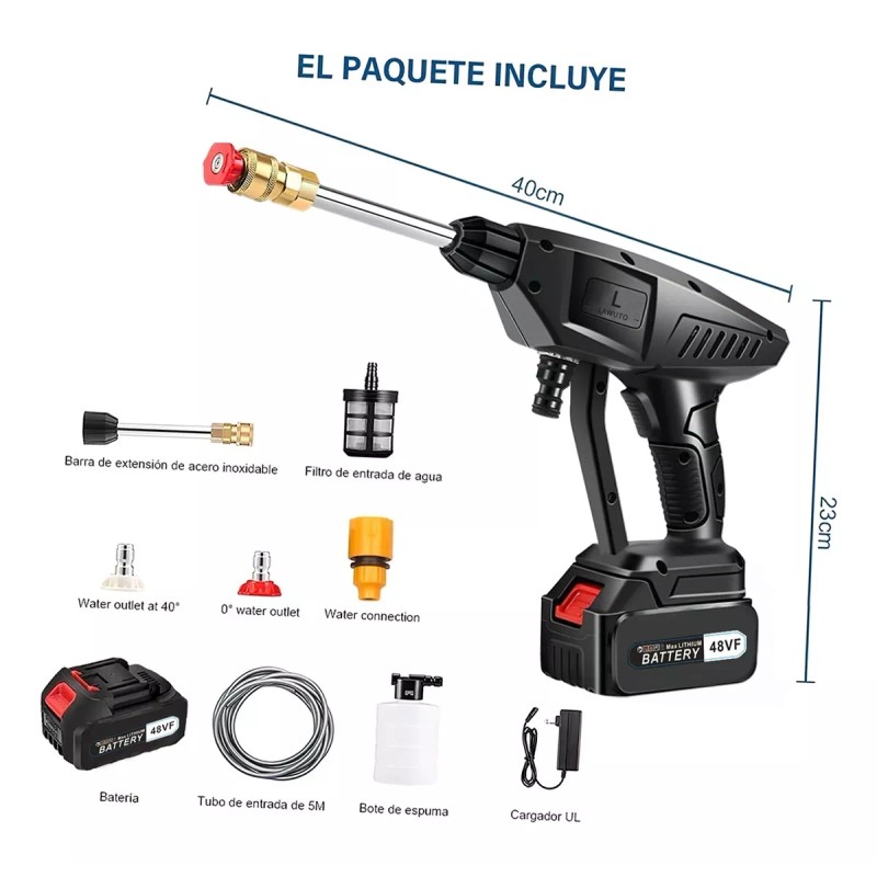 - Accesorios incluidos: 1 *Lavado de coches 1 *Estuche de transporte 2 * baterías de litio 48V 1 * Cargador 1 * boquilla de 0° 1 * boquilla de 45° 1 * Filtro 1 * Tubo de extensión de acero inoxidable 1 * Manguera de agua de 5M 1 * Acoplamiento de manguera 1 * Jarra de espuma 1 *