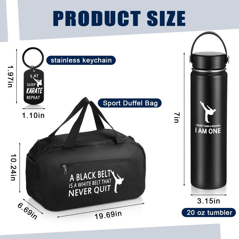 Layhit 3 Pcs Karate Gifts for Boys Include Large Martial Arts Duffel Bag 24 oz Stainless Steel Sport Water Bottle Funny Karate Keychain Taekwondo Gifts for Boys Active Athletes Gym Taekwondo (Black)