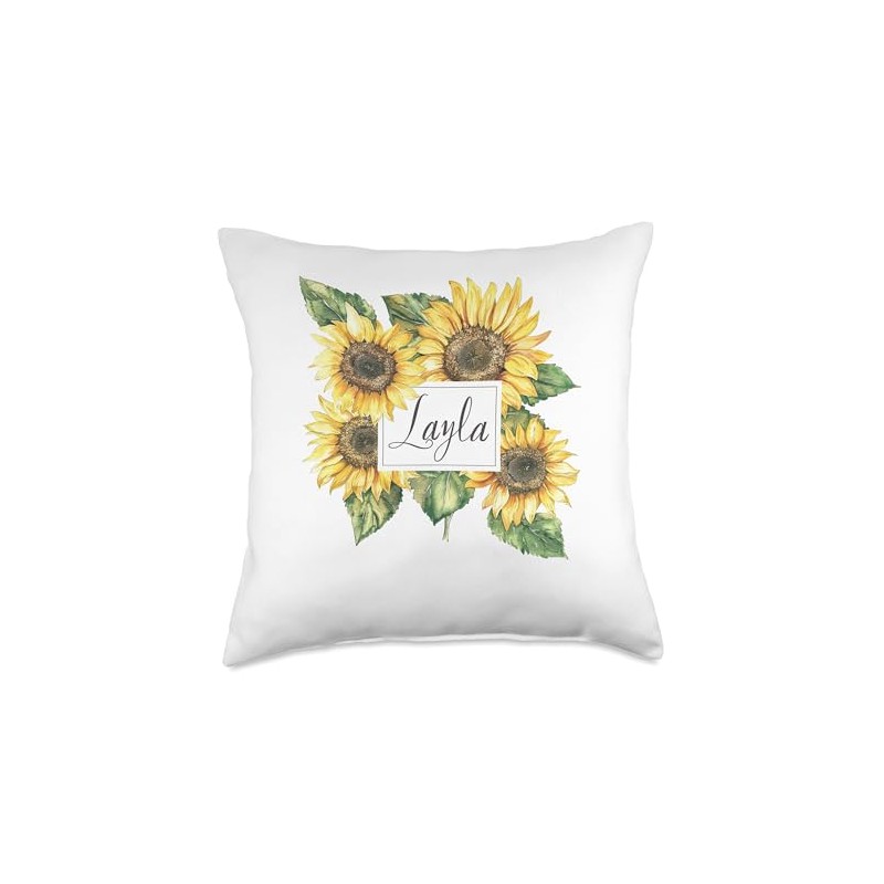 Layla Female Name Floral Spring Watercolor Sunflower Throw Pillow