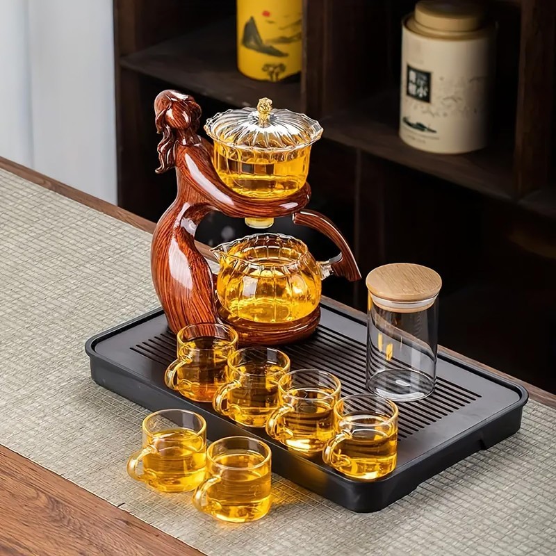 Lazy Kungfu Magnetic Tea Pot, Semi Automatic Glass Teapot, Lazy Kungfu Drip Teapot, Magnetic Attraction Water Rotating Cover Bowl Suitable for Home/Office Reception Tea Set (Red Maiden)